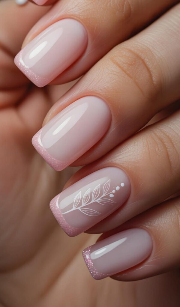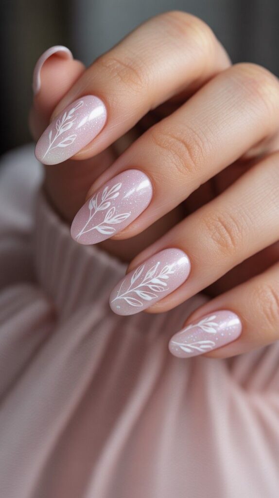 Soft sheer blush short oval nails featuring hand-painted white leafy vine motifs with subtle iridescent glitter — serene, poetic, and full of springtime grace. The glossy finish mimics dew on new growth, and the short length keeps it practical for real life. Like a whispered love letter, worn on your fingertips.