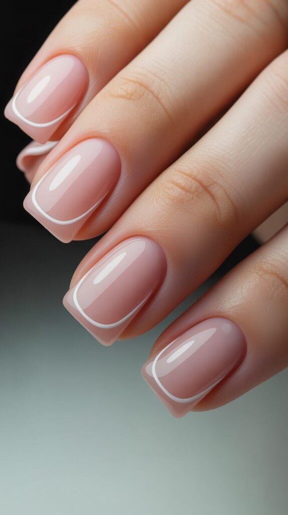 Glossy light pink short squoval nails with clean, curved white lines at the tip’s edge—architectural, refined, and deeply timeless. The high-shine finish enhances the precision, and the compact shape ensures all-day durability. A modern French reimagined for 2026.