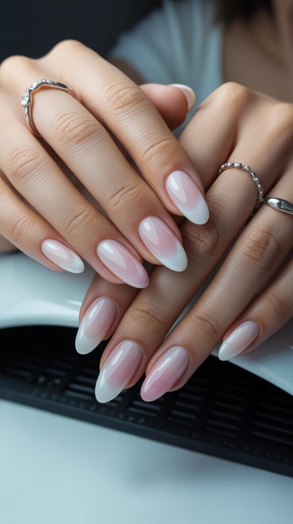 Glossy short almond nails in seamless light pink-to-sheer-white ombré, evoking dawn on bare skin—soft, luminous, and effortlessly modern. The high-shine finish catches light like morning dew, and the compact shape ensures all-day comfort. No embellishment needed: purity, polished.