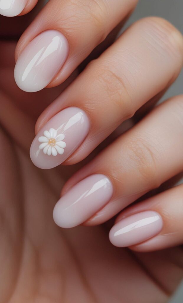 Sheer blush short oval nails featuring one accent finger with a single hand-sculpted white daisy—petals soft, center golden, and base subtly iridescent. The high-shine finish makes it glow, and the short length keeps it effortlessly wearable. Simplicity, elevated.