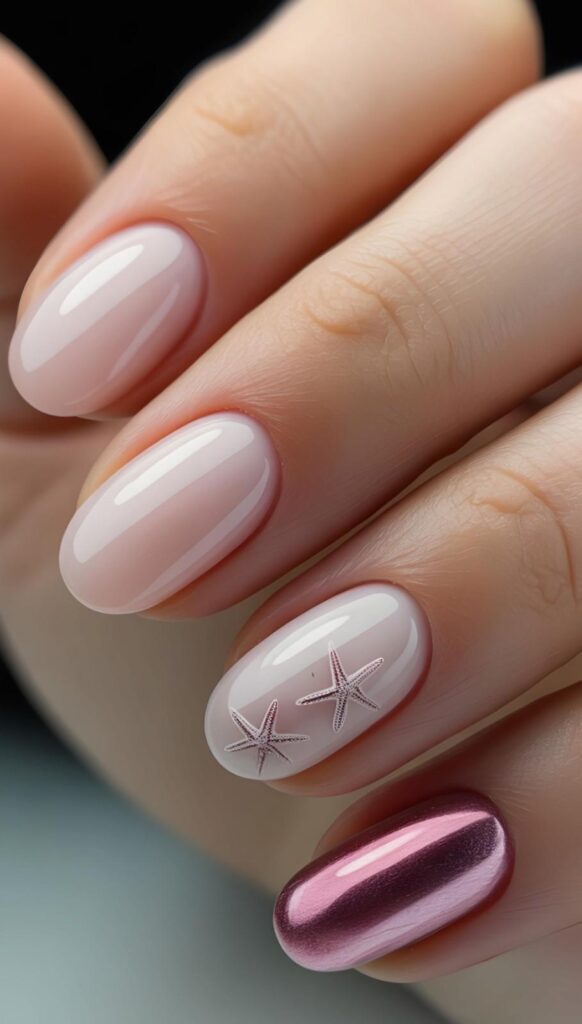 Glossy sheer-light-pink short almond nails with two accent fingers featuring delicate silver-starfish decals—and one bold metallic rose-pink stiletto nail that shifts like liquid pearl. The contrast between matte-soft and high-shine luxe creates modern dimension. A seaside whisper, worn with sophistication.