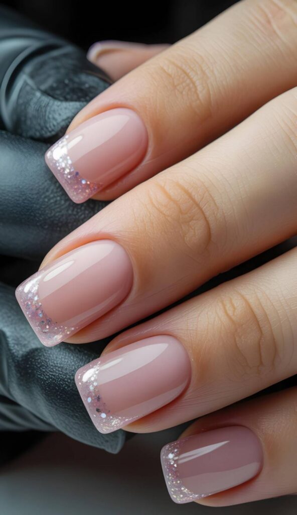 Glossy light pink short rounded-square nails with sheer French tips embedded with iridescent micro-glitter (pink, silver, holographic) — delicate, sparkling, and full of inner light. The high-shine finish amplifies the shimmer, and the compact shape ensures comfort for real life. Magic, contained.