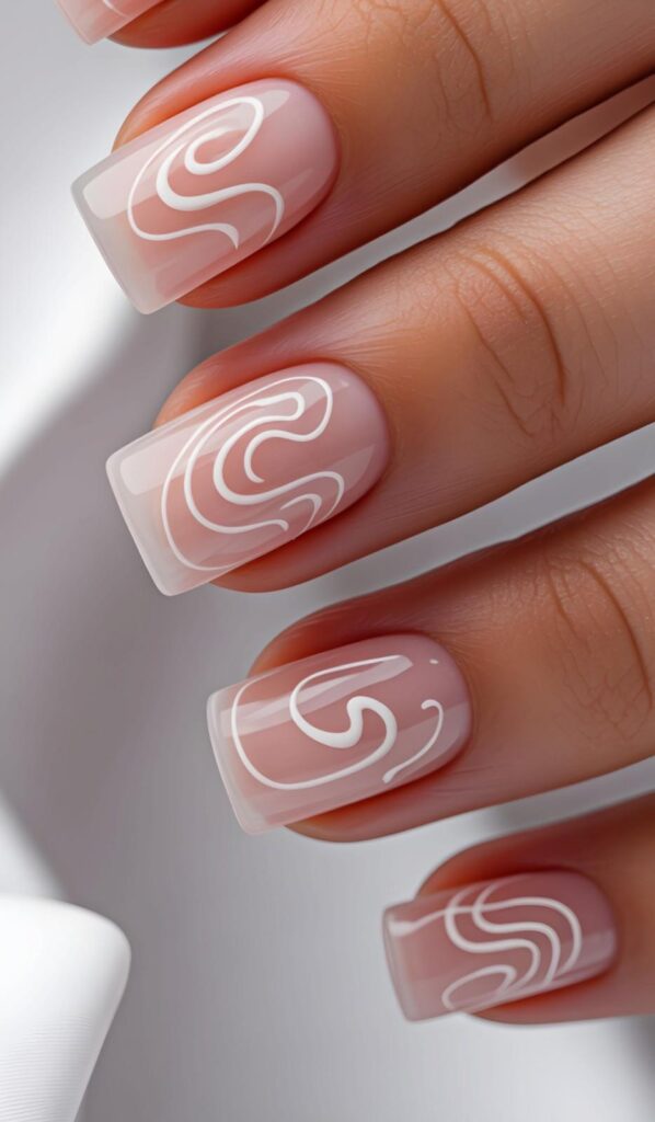 Sheer light pink short coffin nails adorned with hand-painted white fluid swirls — dreamy, expressive, and full of artistic movement. The glossy topcoat adds depth, and the medium shape balances drama with wearability. Emotion, translated into polish.