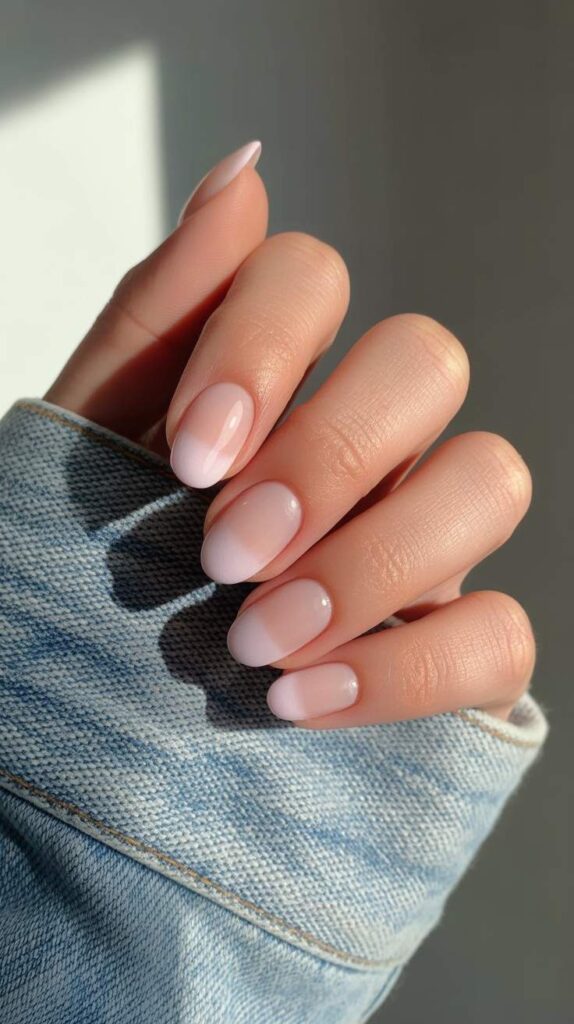 Smooth light pink short oval nails transitioning seamlessly into sheer white at the tips — ethereal, luminous, and full of gentle movement. The high-shine finish mimics dew on petals, and the compact shape ensures all-day comfort. Renewal, worn with grace.