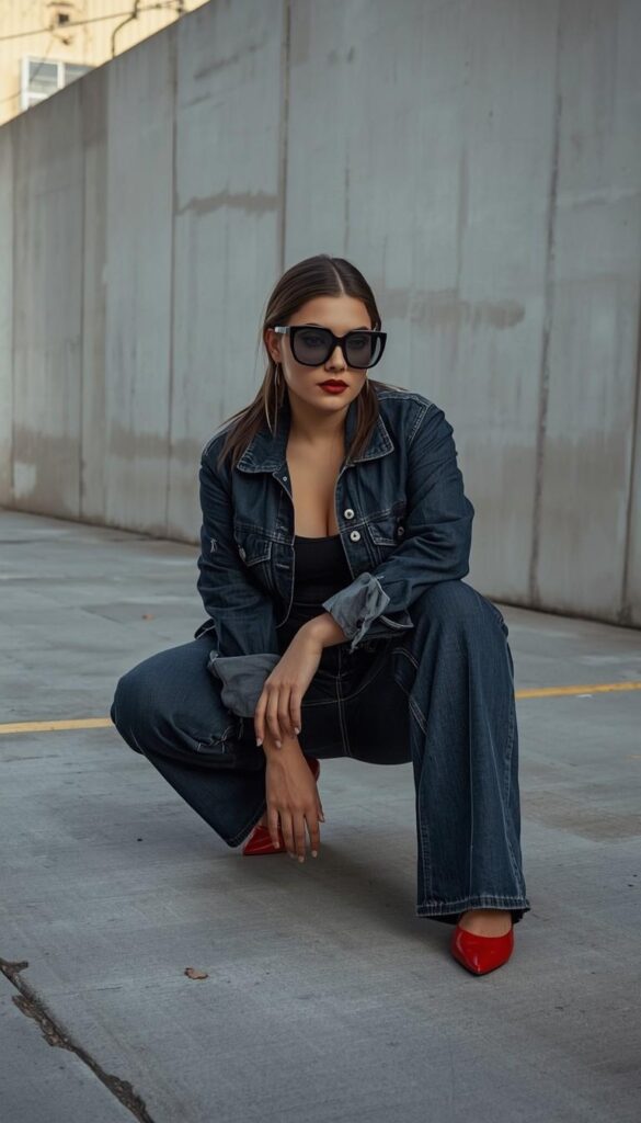 A classic medium-wash denim jacket (notched lapel, rolled sleeves) worn open over a black ribbed tank, paired with high-waisted wide-leg denim jeans (cuffed ankles, subtle fade), styled with bold red pointed-toe pumps, oversized black sunglasses, and gold hoop earrings. The model crouches confidently against a weathered concrete wall—sunlight catching the red soles, hair softly windswept, expression poised and unshaken. The look is bold, modern, and deeply empowering—curves framed by structure, confidence amplified by contrast.