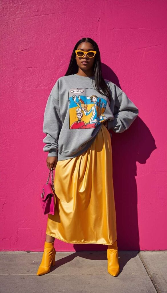 A oversized grey sweatshirt with vibrant comic-style graphic print (colorful figures, speech bubble text) paired with a flowing mustard-yellow satin midi skirt (A-line cut, side slit), styled with bright yellow pointed-toe booties, oversized yellow cat-eye sunglasses, and a hot-pink mini crossbody bag. The model stands against a saturated fuchsia wall—shadow sharp behind her, hair sleek, pose confident and joyful. The look is playful, artistic, and unapologetically bold—midsize magic, amplified by contrast and color.