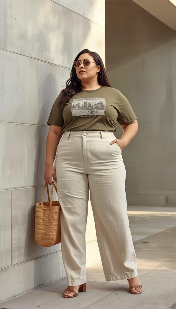 A soft olive-green short-sleeve tee (V-neck, relaxed fit) paired with high-waisted oat-colored wide-leg trousers (subtle texture, ankle-length), styled with tan block-heel sandals, a woven circular raffia tote, and delicate gold layering necklaces. The model stands on a sunlit concrete sidewalk—modern building facade blurred behind her, hands gently in pockets, hair loose, expression serene and joyful. The palette is warm, cohesive, and full of quiet harmony—summer ease, perfectly calibrated for midsize grace.