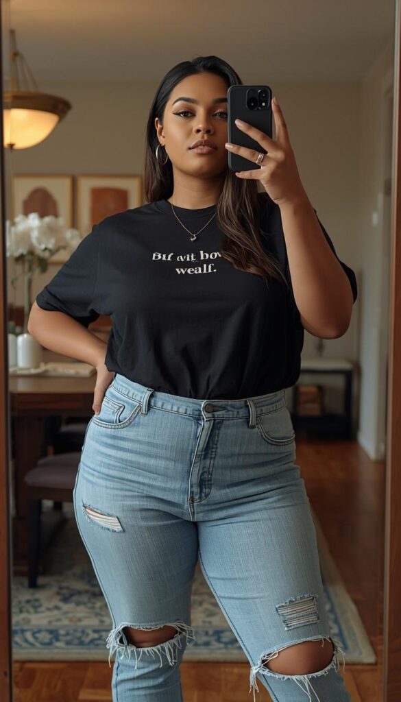 A black short-sleeve tee with elegant white serif text (“But with love, we all heal.”) paired with high-waisted light-wash distressed jeans (ripped knees, frayed hems, cuffed ankles), styled with delicate gold chain necklaces and small hoop earrings. The model takes a mirror selfie in a cozy, sunlit room—wood floors, floral rug, and soft furnishings behind her, expression calm, eyes steady, smile tender. The look is meaningful, modern, and deeply personal—fashion as affirmation, worn with quiet strength.