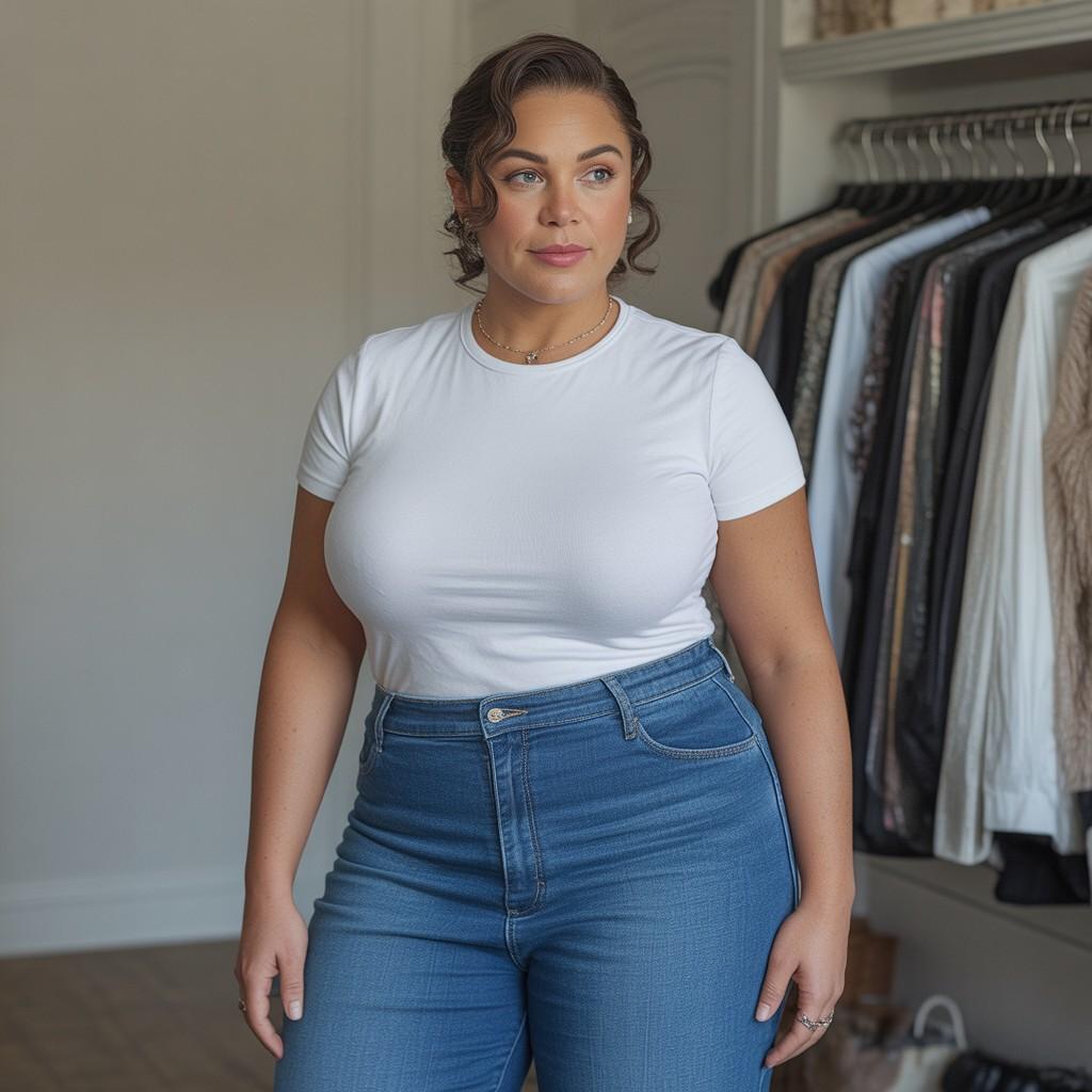 A fitted white ribbed short-sleeve tee (V-neck, clean hem) paired with high-waisted medium-wash straight-leg jeans (cuffed hems, subtle fade), styled with delicate gold chain necklaces and small hoop earrings. The model stands in a softly lit closet space—racks of clothing blurred behind her, hands relaxed at her sides, gaze direct, smile gentle and assured. The look is timeless, clean, and deeply wearable—proof that simplicity, when cut for you, becomes iconic.