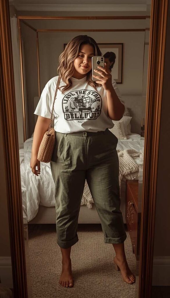 A white oversized tee with bold black graphic print (“Lead the Stair, Belliful”) paired with high-waisted olive-green cropped wide-leg trousers (cuffed hems, clean drape), styled barefoot and holding a phone in a full-length mirror selfie. The setting is a sun-dappled bedroom—white bedding, woven rug, and warm wood tones behind her, smile gentle and grounded. The look is playful, personal, and deeply wearable—confidence that doesn’t shout; it smiles.
