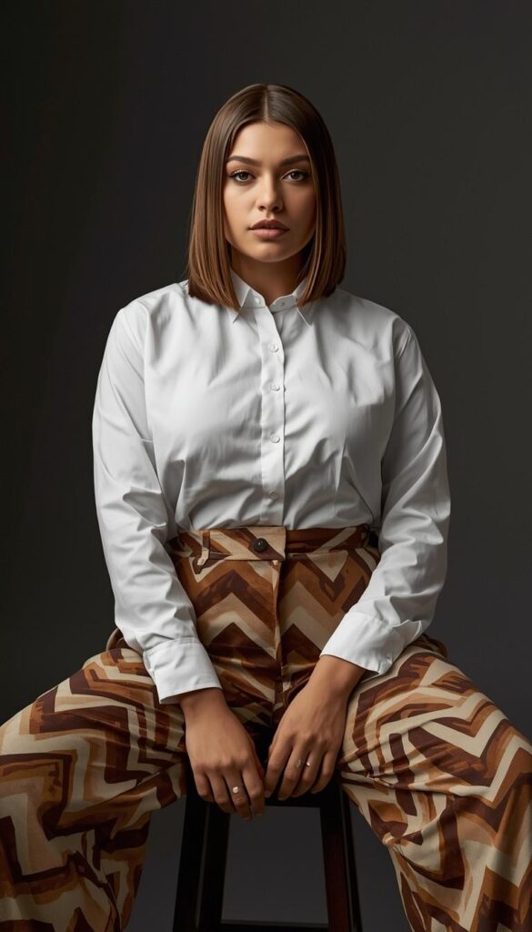 A classic long-sleeve white button-down shirt (notched collar, chest pocket, clean hem) tucked into high-waisted wide-leg trousers in bold brown-and-cream geometric print (sharp pleats, ankle-length), styled with tan flat sandals and delicate gold hoop earrings. The model sits poised on a dark stool against a deep charcoal studio backdrop—hands gently clasped, expression calm and powerful. The silhouette is elongating, architectural, and deeply intentional—elegance that honors full-figured presence without restraint.