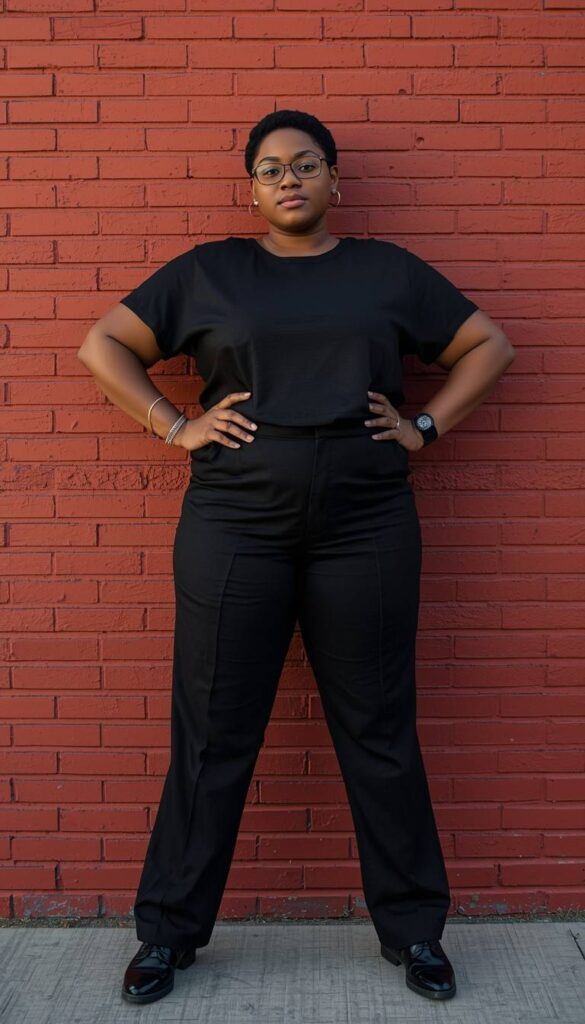 A fitted black short-sleeve tee (clean hem, round neckline) paired with high-waisted black tailored trousers (sharp crease, ankle-length), styled with polished black loafers, gold hoop earrings, and a sleek black watch. The model stands with hands on hips against a vibrant red brick wall—light even and direct, posture strong, gaze calm and assured. The silhouette is sleek, elongating, and deeply intentional—monochrome made magnetic for midsize presence.