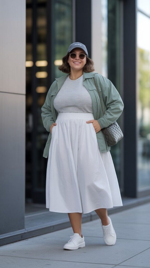 A striped ribbed crop tee (ivory and grey horizontal stripes) layered under a relaxed-fit sage-green utility jacket (notched collar, roll-up sleeves), paired with a high-waisted white A-line midi skirt (clean hem, subtle drape), styled with white platform sneakers, a quilted taupe crossbody bag, and a denim baseball cap. The model stands confidently on a sunlit city sidewalk—modern architecture behind her, hands in pockets, smile warm and assured. The look is fresh, modern, and deeply flattering—curves celebrated through proportion and movement.