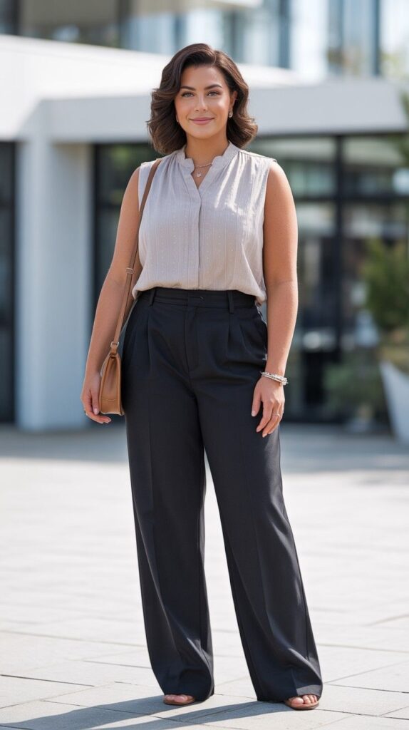 3) Sleeveless Blouse & Wide-Leg Trousers in Modern Plaza