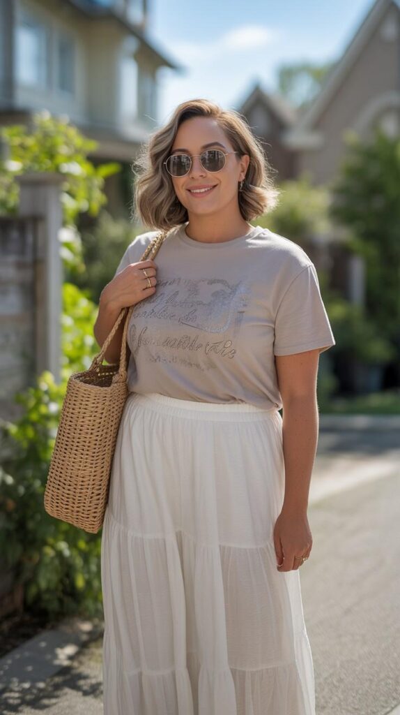 A soft oat-colored short-sleeve tee with delicate silver-embroidered script (“Sunset & Salt”) paired with a flowing off-white tiered midi skirt (elastic waist, subtle side slit), styled with tan leather slide sandals and a woven circular raffia tote. The model walks down a leafy residential street—greenery blurred behind her, hair softly windswept, expression serene and joyful. The palette is gentle, cohesive, and full of quiet joy—summer ease, perfectly tailored for midsize elegance.