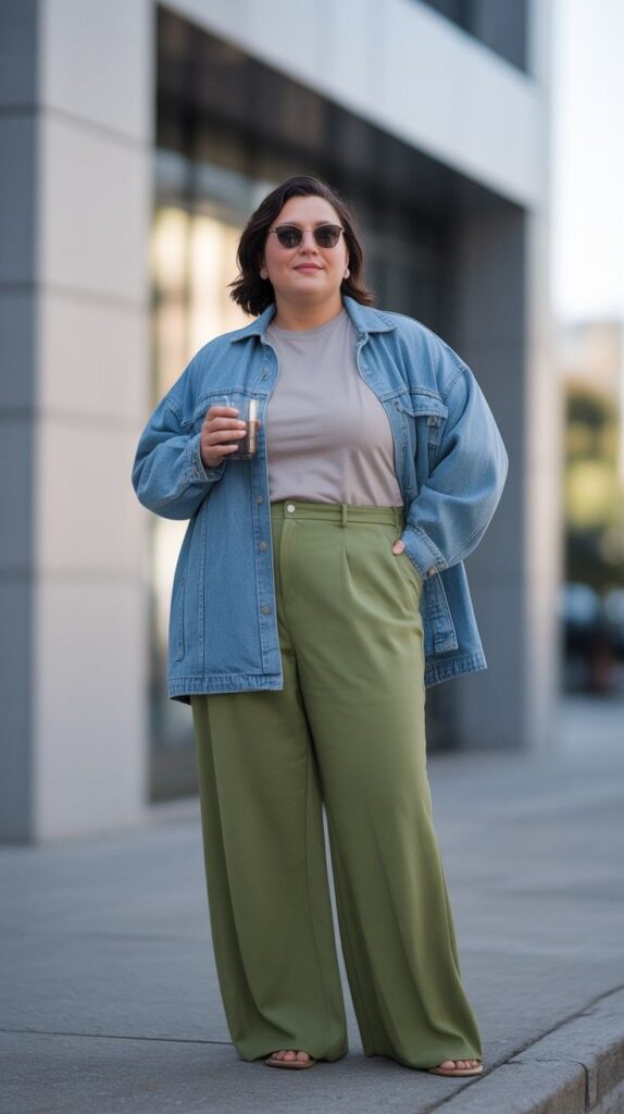 A soft oat-colored ribbed tank layered under a cropped light-wash denim jacket (classic fit, rolled sleeves), paired with high-waisted olive-green wide-leg trousers (subtle texture, cuffed ankles), styled with tan leather slide sandals, a woven raffia tote, and delicate gold layering necklaces. The model stands on a sun-dappled city sidewalk—modern buildings blurred behind her, hands in pockets, expression serene and grounded. The palette is earthy, cohesive, and full of quiet strength—comfort that moves with purpose.