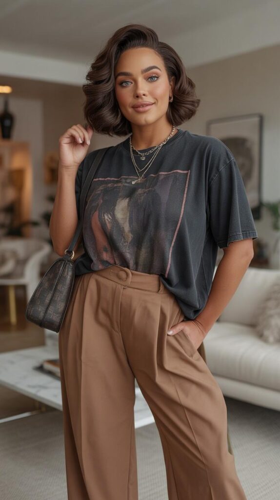 A dark charcoal oversized tee with vintage-inspired graphic print (soft wash, cropped hem) paired with high-waisted camel-wide-leg trousers (paper-bag waist, clean drape), styled with tan block-heel sandals, layered gold necklaces, and a textured brown crossbody bag. The model stands in a bright, minimalist interior—white sofa and abstract art behind her, hands gently in pockets, expression calm and assured. The look is modern, grounded, and deeply wearable—midsize magic, reimagined for real life.