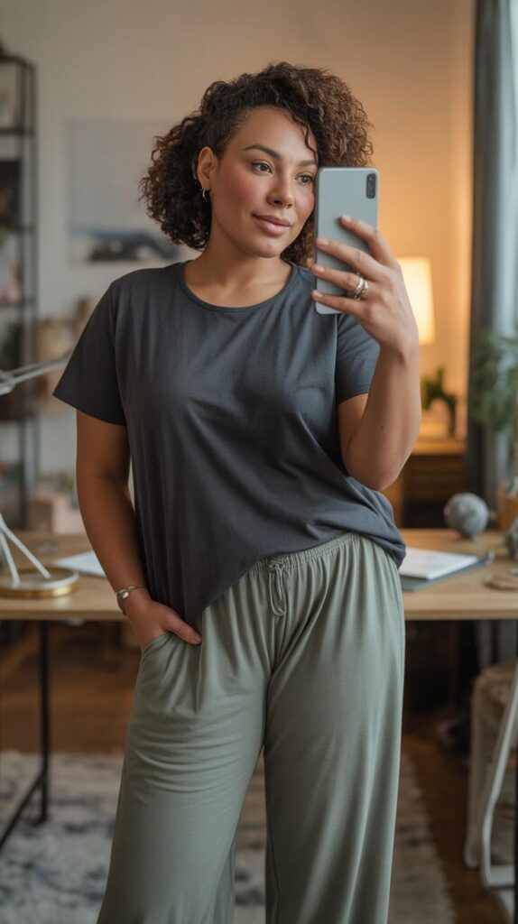 A soft charcoal short-sleeve knit top (V-neck, clean hem) paired with high-waisted olive-green wide-leg lounge pants (drawstring waist, smooth drape), styled with tan leather slide sandals and a delicate gold pendant necklace. The model takes a mirror selfie in a cozy home studio—wooden dresser, potted plants, and soft textiles behind her, expression calm, smile gentle. The fabric flows like breath; the silhouette is fluid, flattering, and full of quiet strength—comfort that honors your body, your time, and your peace.