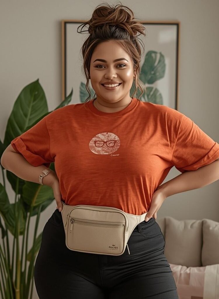 A rich terracotta-orange short-sleeve tee (relaxed fit, crew neckline) featuring a subtle graphic print of vintage sunglasses, paired with high-waisted black biker shorts (smooth drape, clean hem), styled with a beige structured waist bag (zippered pockets, gold hardware) and bare feet. The model stands confidently in a sunlit living room—large monstera plant beside her, framed botanical art on the wall, hair in a voluminous top knot, smile bright and assured. The look is energetic, modern, and deeply flattering—curves celebrated through balance and joy.