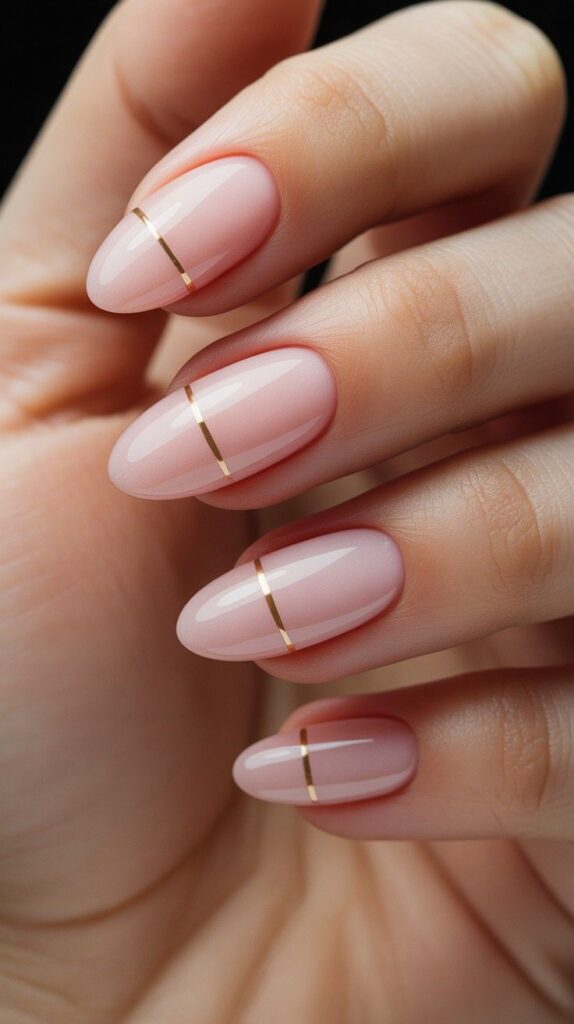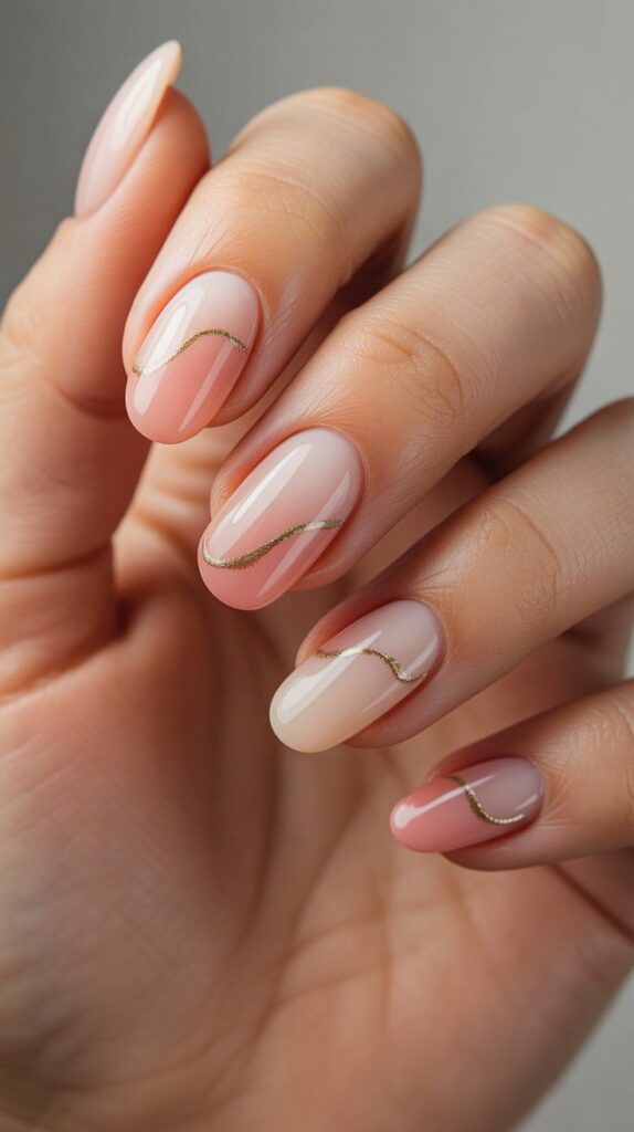 Sheer blush-pink short almond nails with a seamless gradient fade toward the tip, accented by delicate hand-painted gold metallic lines in fluid wave patterns. The glossy finish enhances the dimension, and the elongated shape flatters every hand. Serene, modern, and deeply calming—like breath held in sunlight.