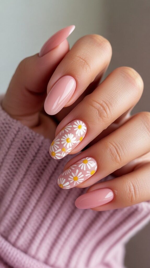 Glossy short almond nails in sheer nude-pink, adorned with scattered hand-painted white daisies (yellow centers) and fine green vine details. The high-shine finish makes the colors glow, and the elongated shape flatters every hand. Playful, cohesive, and full of springtime rhythm—like a meadow in miniature.