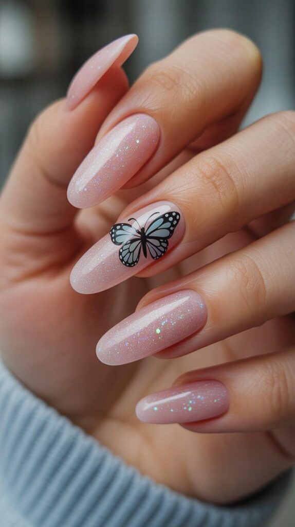 Soft blush-pink short stiletto nails embedded with fine iridescent glitter (gold, aqua, pearl), one accent finger featuring a realistic 2D black-and-white butterfly with subtle shimmer wings. The high-shine finish makes the sparkle dance in light, and the sharp shape adds modern drama. Ethereal, joyful, and full of transformation.