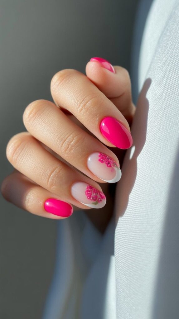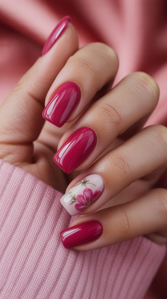 Vibrant glossy deep magenta short oval nails, one accent finger showcasing a raised 3D pink blossom with gold center and delicate green leaves. The high-shine finish makes the color radiate, and oval shape ensures wearability without fragility. Confident, romantic, and deeply intentional—joy with weight.