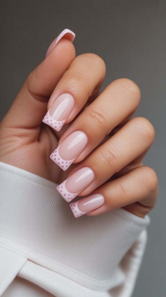 Glossy short squoval nails in sheer nude base with crisp blush-pink French tips, two accent fingers adorned with delicate pink micro-polka dots along the tip edge. The high-shine finish unifies the look, and the compact shape ensures all-day comfort. Playful, nostalgic, and deeply wearable—like childhood joy, reimagined for now.