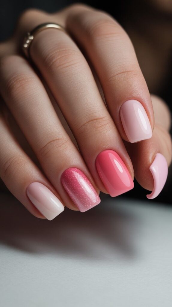 Short squoval nails in a curated trio: sheer nude-pink matte, vibrant fuchsia glossy, and sparkling rose-pink shimmer—each nail uniquely expressive yet harmoniously balanced. The high-shine finishifies the palette, and the compact shape ensures all-day wearability. Not matchy-matchy—intentionally diverse.