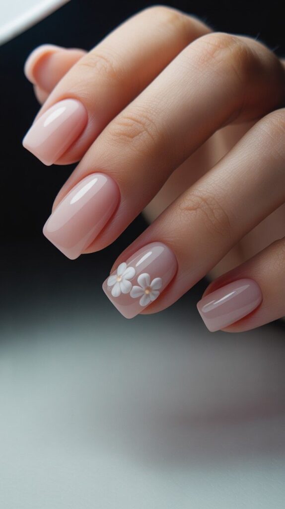 Soft matte-blush short square nails, two accent fingers showcasing raised 3D white blossoms with gold centers and fine green leaf details. The satin finish adds depth, and the crisp square shape ensures elegance without fragility. Romantic, tactile, and deeply intentional—like love made visible.