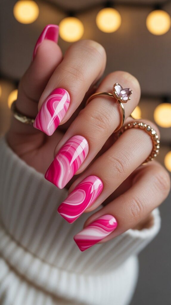 Vibrant glossy fuchsia short squoval nails featuring fluid marbled swirls of deep pink and white—dynamic, modern, and full of joyful energy. The high-shine finish makes the colors vibrate, and the compact shape ensures durability through real life. Not chaotic—curated passion.