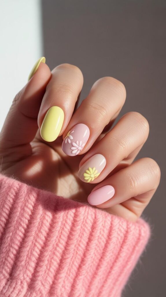 Glossy short almond nails transitioning from pale lemon at the cuticle to soft blush-pink at the tip, two accent fingers featuring raised 3D mini daisies in white and yellow with fine green stems. The high-shine finish enhances the dimension, and the compact shape ensures all-day comfort. Like spring sunlight captured in polish—gentle, radiant, and full of quiet hope.
