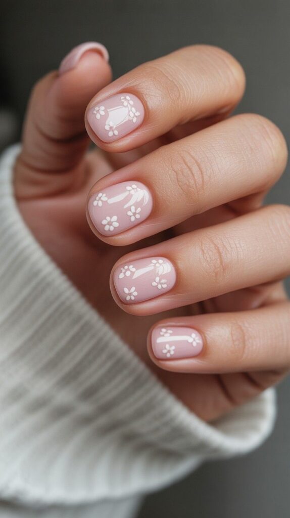 3) Blush Nails with White Blossom Clusters