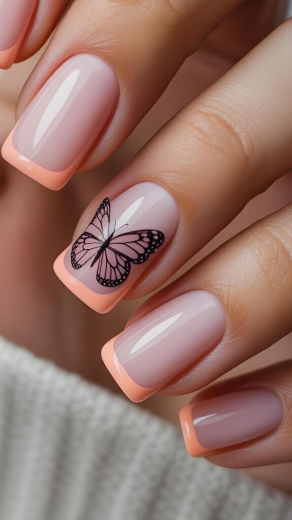 11) Peach French Tips with Butterfly Accent