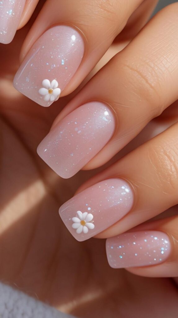 Soft matte-blush short almond nails embedded with fine iridescent glitter (pearl & aqua flecks), two accent fingers showcasing raised 3D white daisies with yellow centers. The satin finish grounds the sparkle, and the elongated shape keeps it elegant and durable. Gentle radiance—no noise, just light.