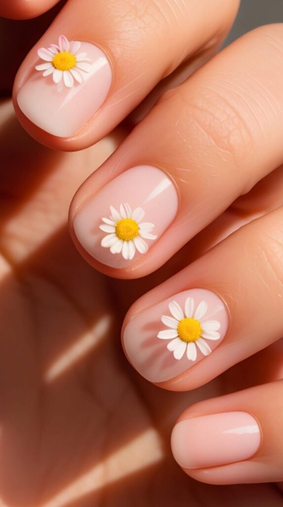 Glossy short oval nails in sheer nude-pink, adorned with scattered hand-painted mini daisies (white petals, yellow centers) and fine green vine details. The high-shine finish makes the colors glow, and the oval shape ensures comfort and elegance. Playful, cohesive, and full of springtime rhythm—like joy, lightly scattered.