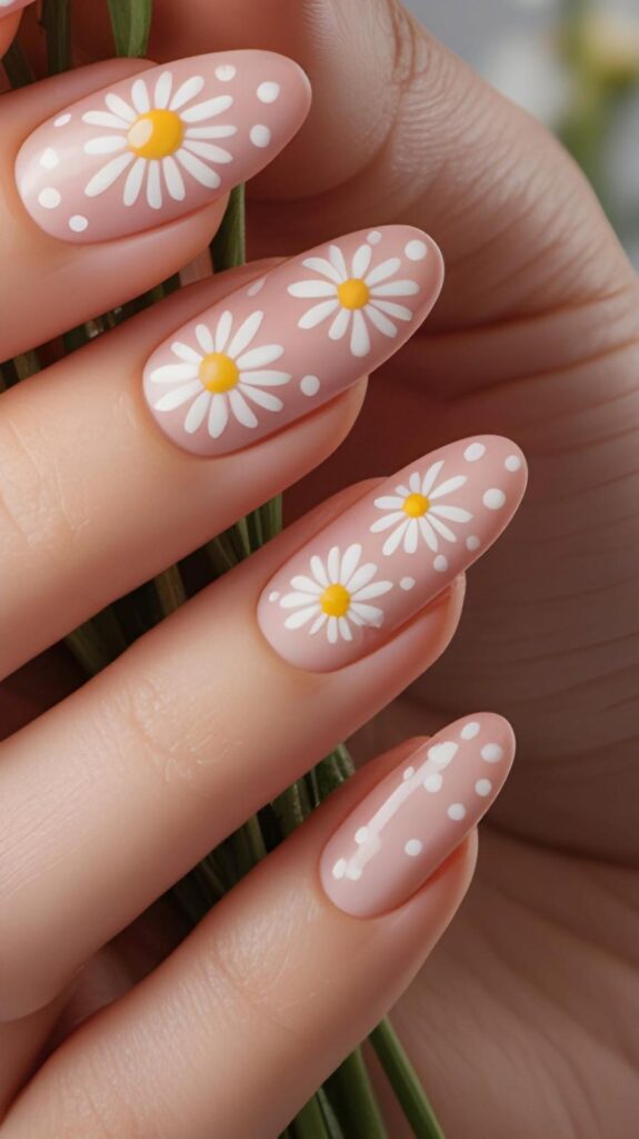 Glossy short almond nails in sheer blush-pink, adorned with hand-painted white daisies (yellow centers) and scattered white micro-polka dots—playful, cohesive, and full of springtime rhythm. The high-shine finish enhances the sweetness, and the elongated shape flatters every hand. Confetti made of petals, worn with confidence.