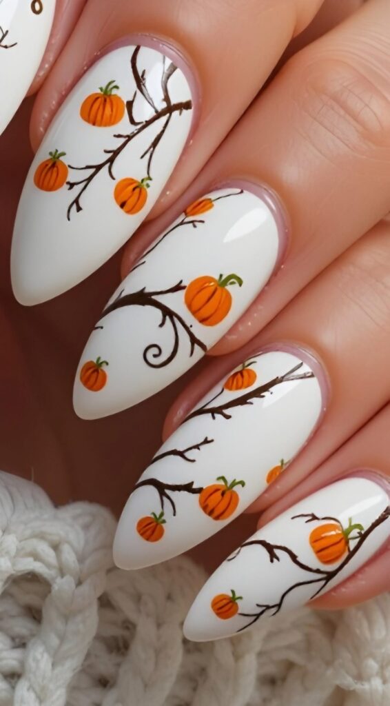 A white base features brown branches and orange pumpkins. The artistic design adds a natural, earthy charm to the stiletto shape.