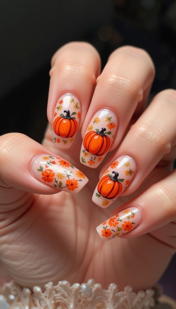 A soft pink base features orange pumpkins and tiny flowers. The delicate details add a romantic, garden-inspired charm to the short, rounded shape.