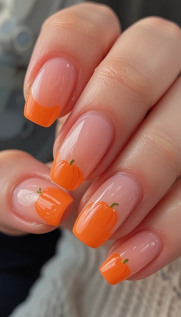 A soft pink base transitions into orange at the tips, with one accent nail featuring a pumpkin. The warm gradient adds a cozy, modern charm to the short, oval shape.