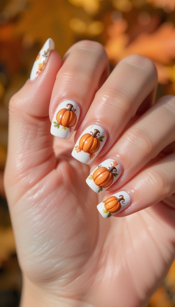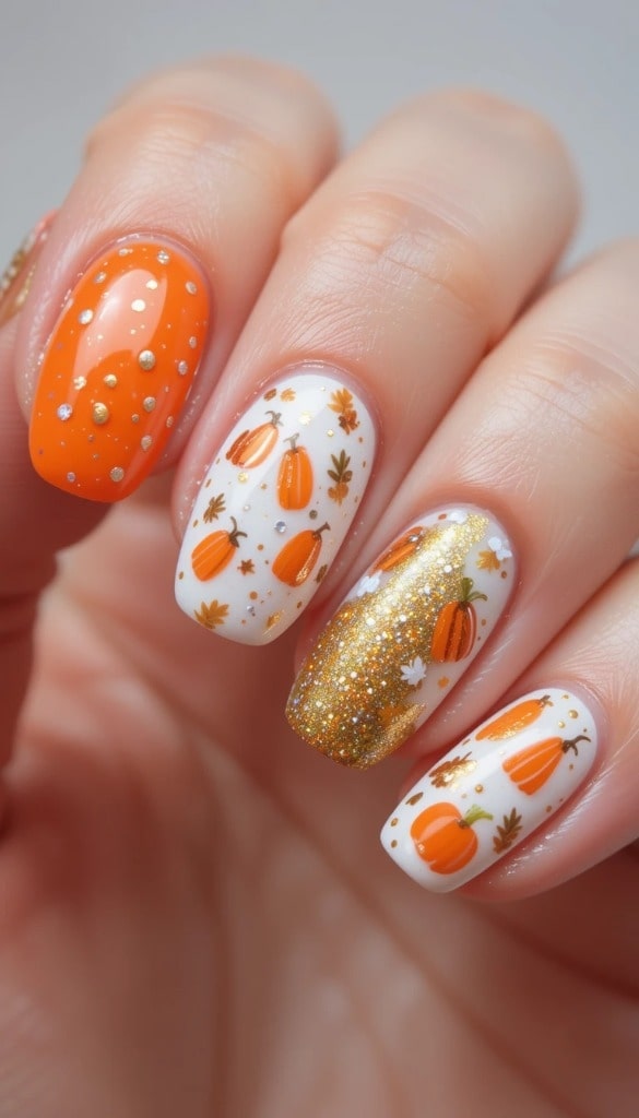 A mix of orange, white, and glittery nails features pumpkins, leaves, and gold accents. The festive details add a cozy, autumnal charm to the almond shape.