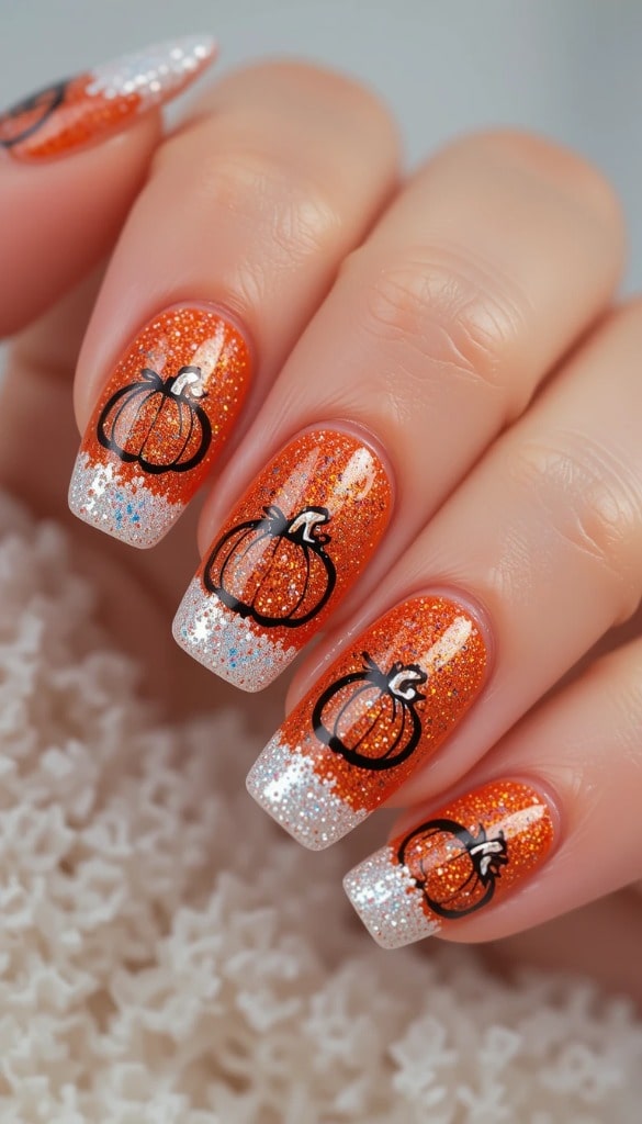 A vibrant orange glitter base features black pumpkin outlines and white glitter tips. The festive contrast adds a playful, holiday-ready charm to the stiletto shape.