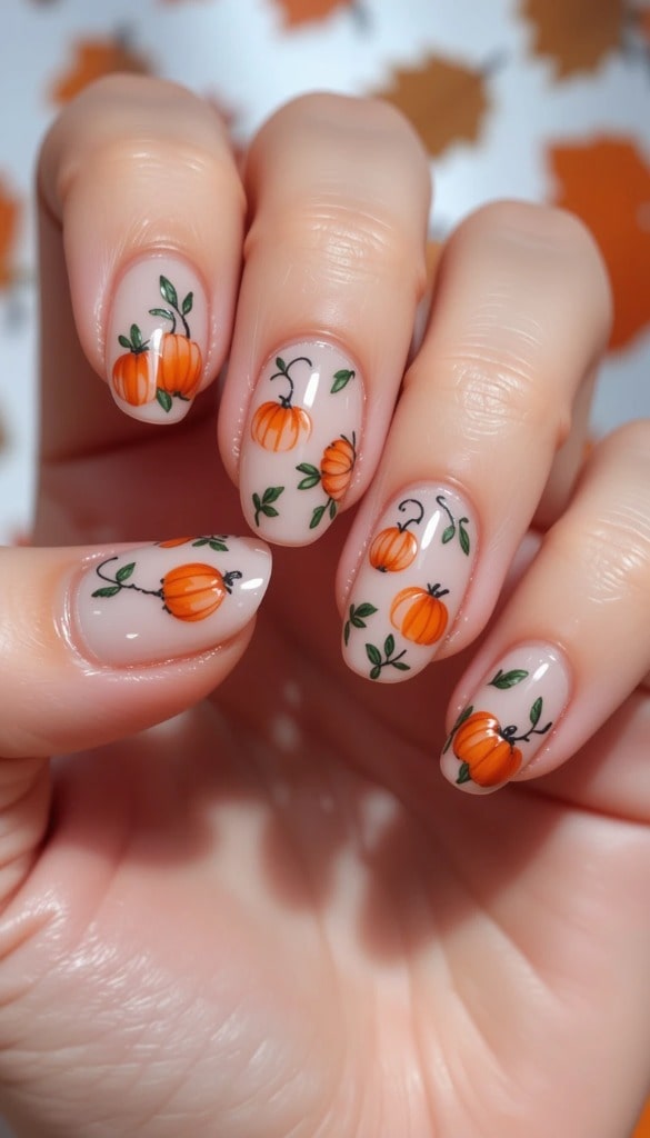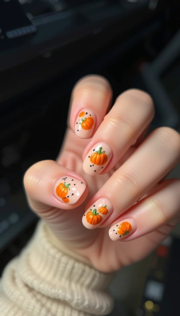 A soft nude base features tiny orange pumpkins with black dots. The simple design adds a playful, seasonal touch to the short, rounded shape.