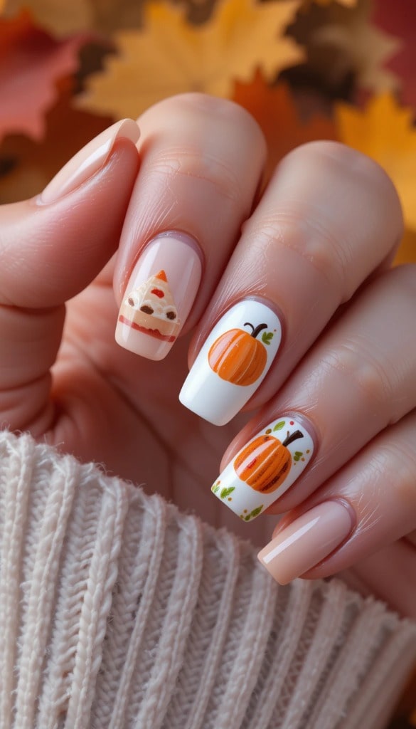 A mix of nude, white, and pumpkin designs features a slice of pumpkin pie and orange pumpkins. The festive details add a playful, holiday-ready vibe to the short, almond shape.