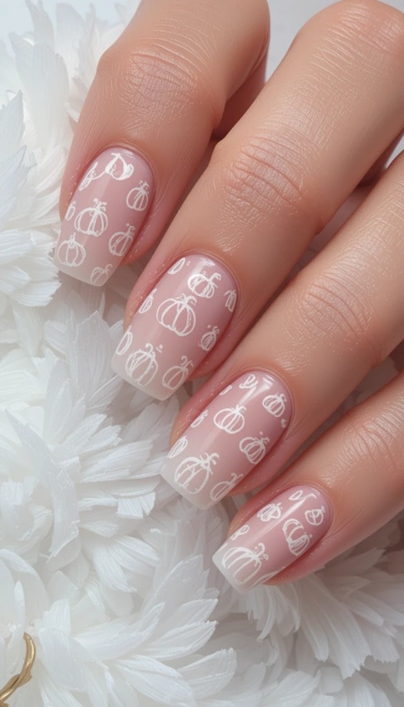 A soft pink base features tiny white pumpkin outlines. The delicate pattern adds a dreamy, autumnal charm to the natural shape.