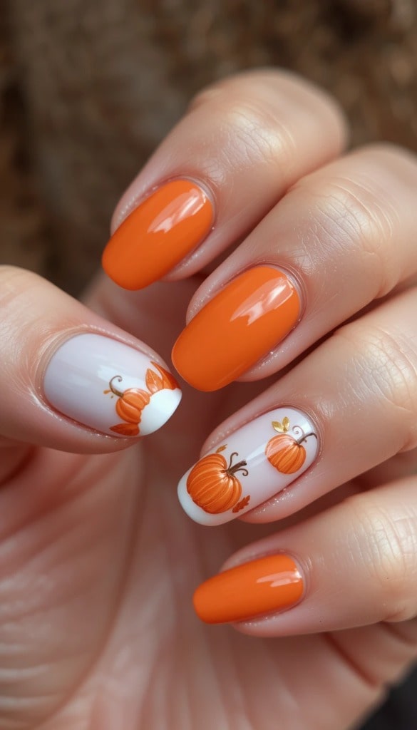 A mix of orange and white nails features one accent nail with a pumpkin design. The bold contrast adds a classic, festive charm to the short, rounded shape.