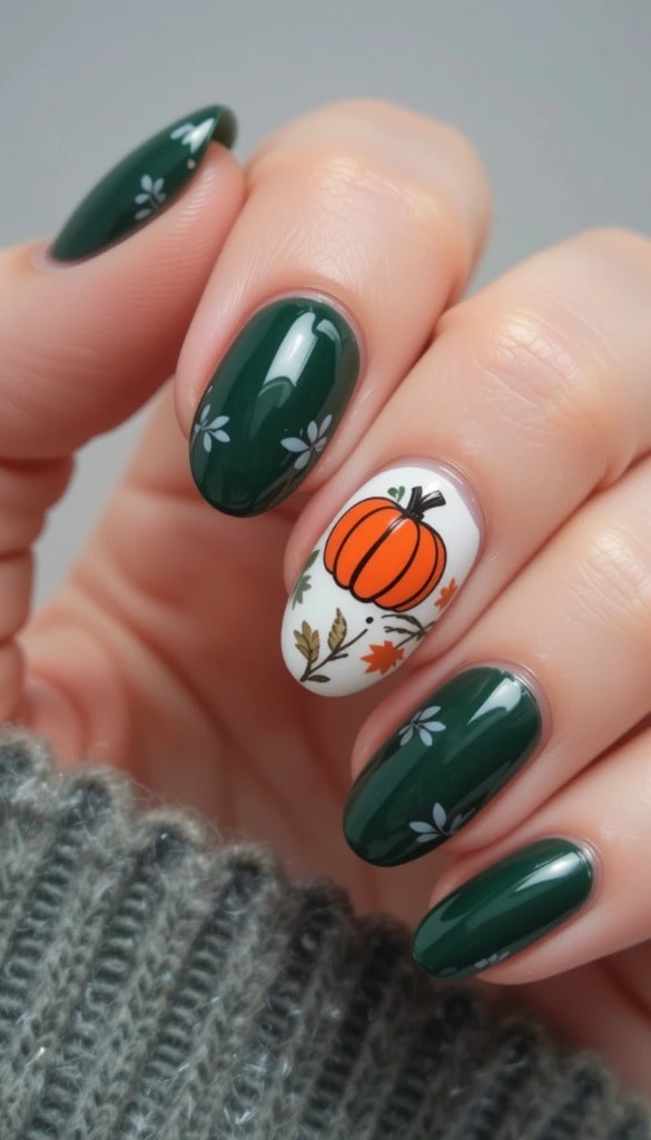 A rich emerald green base features one accent nail with an orange pumpkin and leaves. The earthy tone adds a grounding, autumnal charm to the oval shape.
