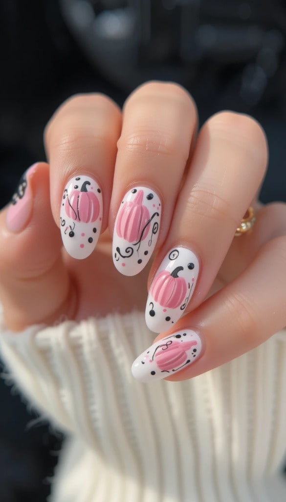 A white base features pink pumpkins with black dots and swirls. The whimsical design adds a fun, playful touch to the stiletto shape.