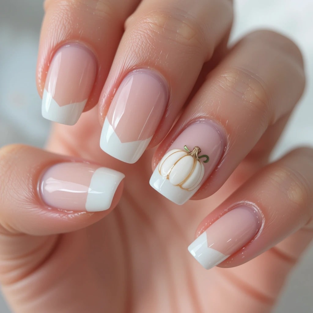 A soft pink base features white French tips and one accent nail with a white pumpkin. The minimalist design adds a delicate, elegant touch to the short, rounded shape.