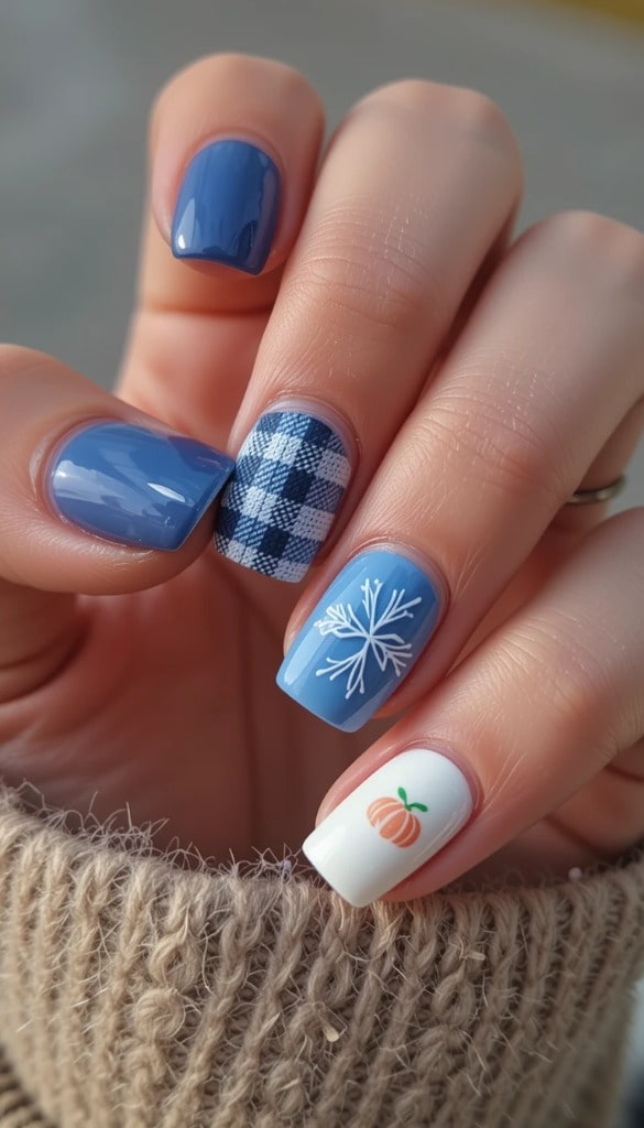 A blue base features plaid patterns, snowflakes, and one accent nail with a pumpkin. The bold contrast adds a winter-meets-fall charm to the short, square shape.